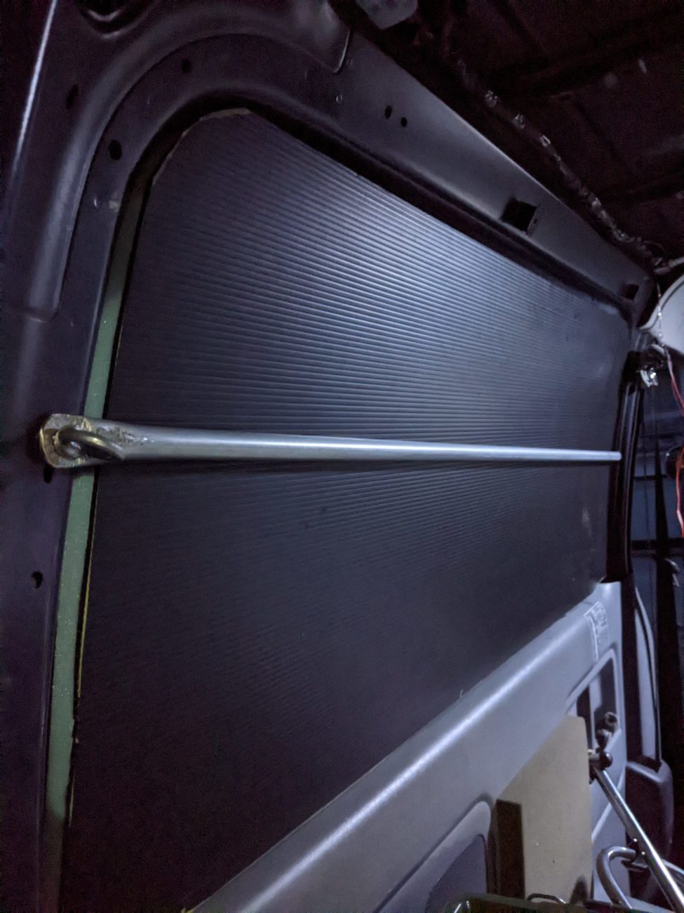 材料はプラスチック段ボールのみ。最初は下の写真のようにウレタンフォームで断熱もするつもりだったのですが、荷物かけれるようにパイプを加工して取り付けてみたら隙間がなさすぎてフックをかけれなかったのでウレタンフォームは用いずにプラスチック段ボールのみになりました。