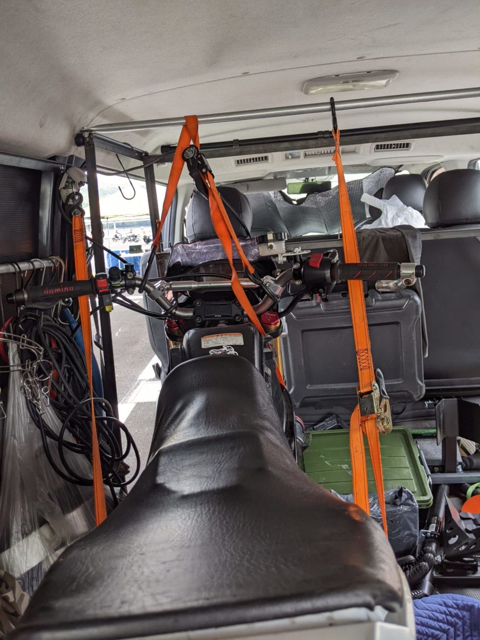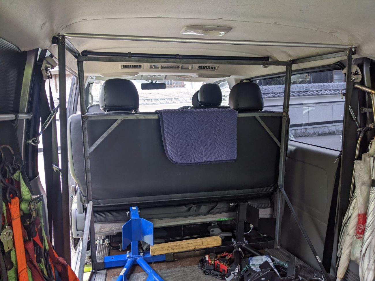 NV200の時は助手席と運転席の後ろに角があったのでそこにフロントタイヤを当てて固定していたのですが、ハイエースで2列目を残した状態だと角がなく2列目シートの後ろに押し当てるしか方法がありませんでした。
