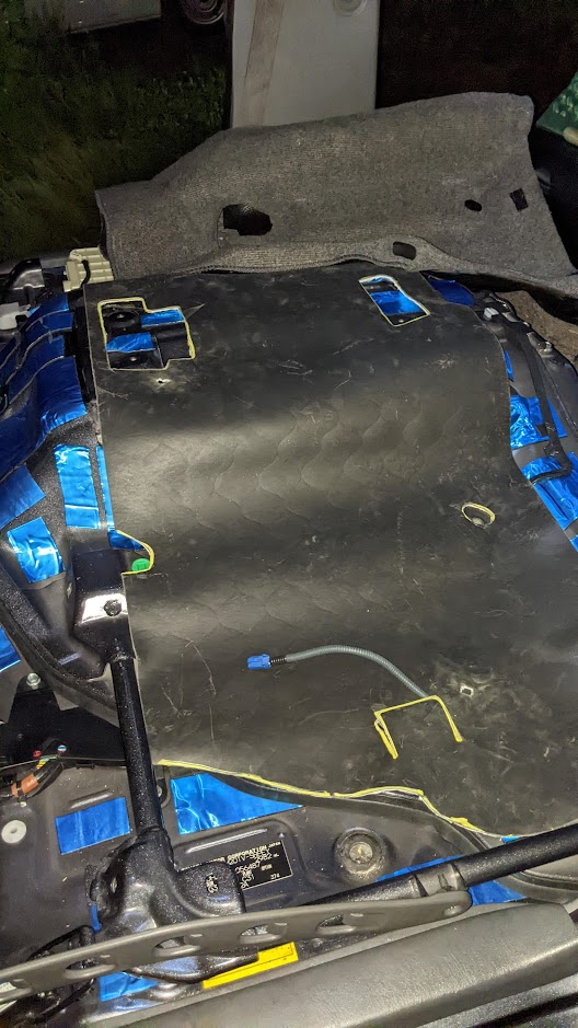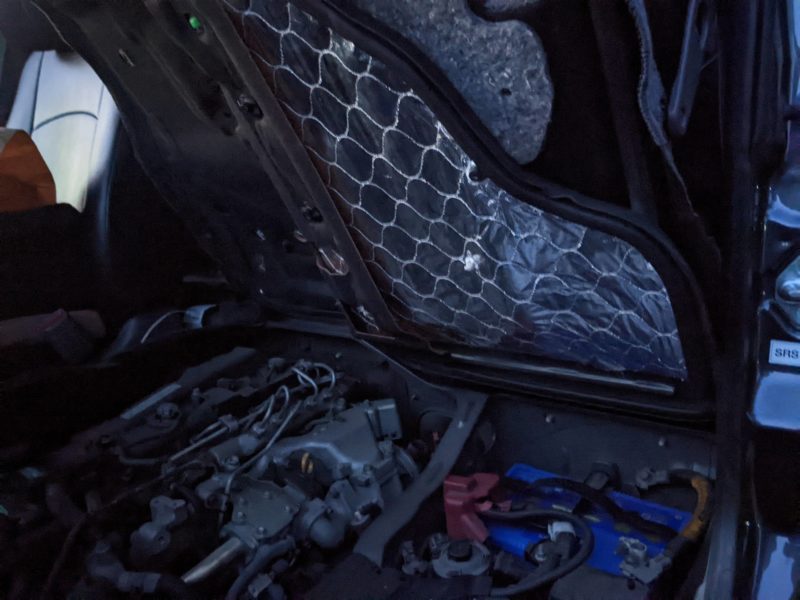 ここもパネル外して両面貼っちゃったほうがいいのかもしれませんが、ブチルゴムなので熱で剥がれてエンジン側に落ちるのもまずいので上から貼るだけにしました。