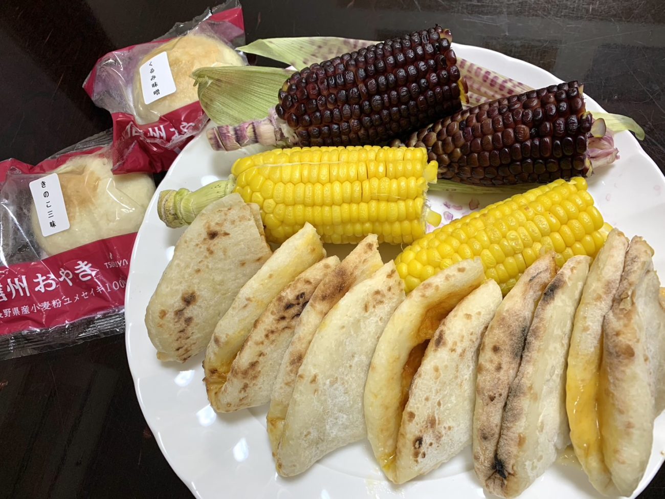 のんびりまったりした後、晩ごはんはもくもくのピザシリーズ、ツルヤで買ったおやき、ファーマーズマーケットで買った変わった色してるとうもろこし、オークボさんから頂いたとうもろこしをもぐもぐ。