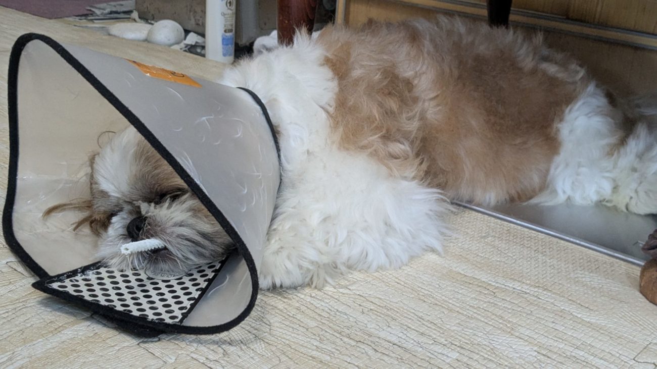 草の実みたいなのが縦に刺さってたのか??って感じのを鑷子で抜き取り、お盆中獣医さんが休みだったので、人用の薬を塗ってカラーつけて様子見…