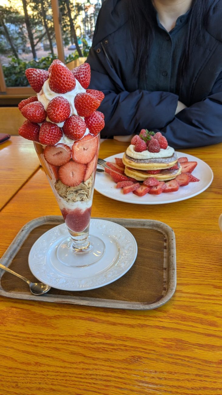 安定と信頼のさちのか苺を野菜市場で確保してから、園内のカフェでスペシャルなパフェとパンケーキをそれぞれ注文🍓✨