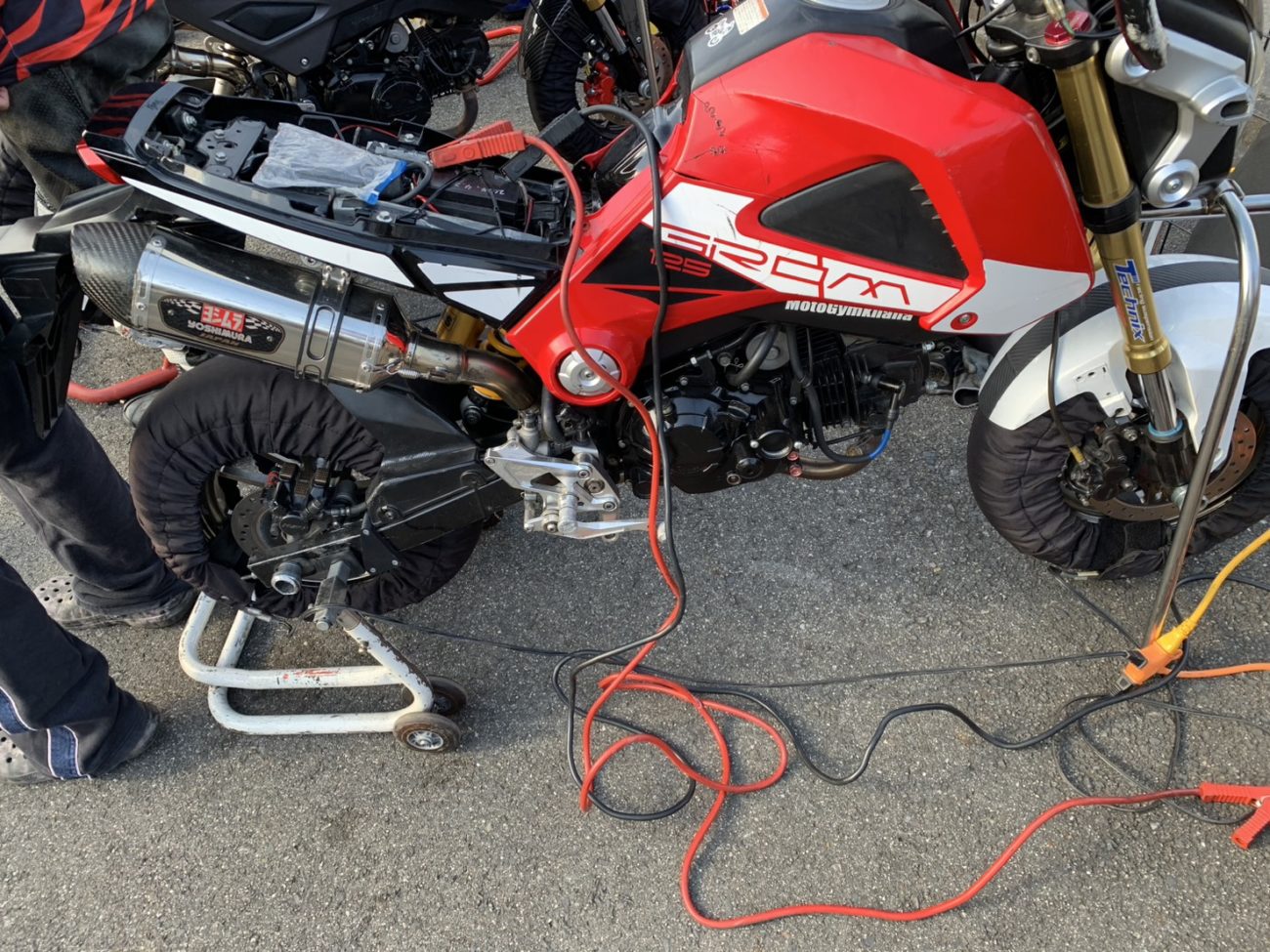 ミーティングが終わったらウォームアップコースを1枠だけ走る時間があったのですが、グロムのバッテリーが上がりかけてたので発電機から12Vとって充電😅