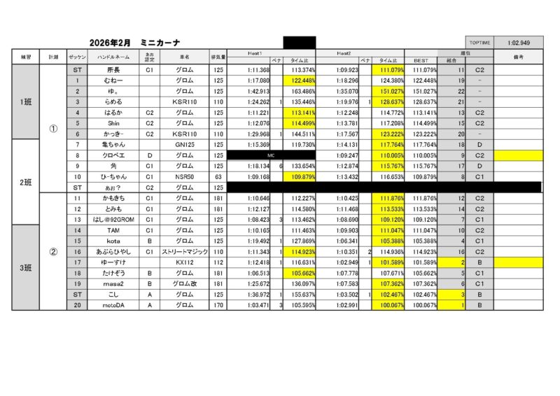1ヒート目に後半グループが転倒続出で荒れましたが、2ヒート目はしっかりと皆タイムを出して以下のような結果になりました。